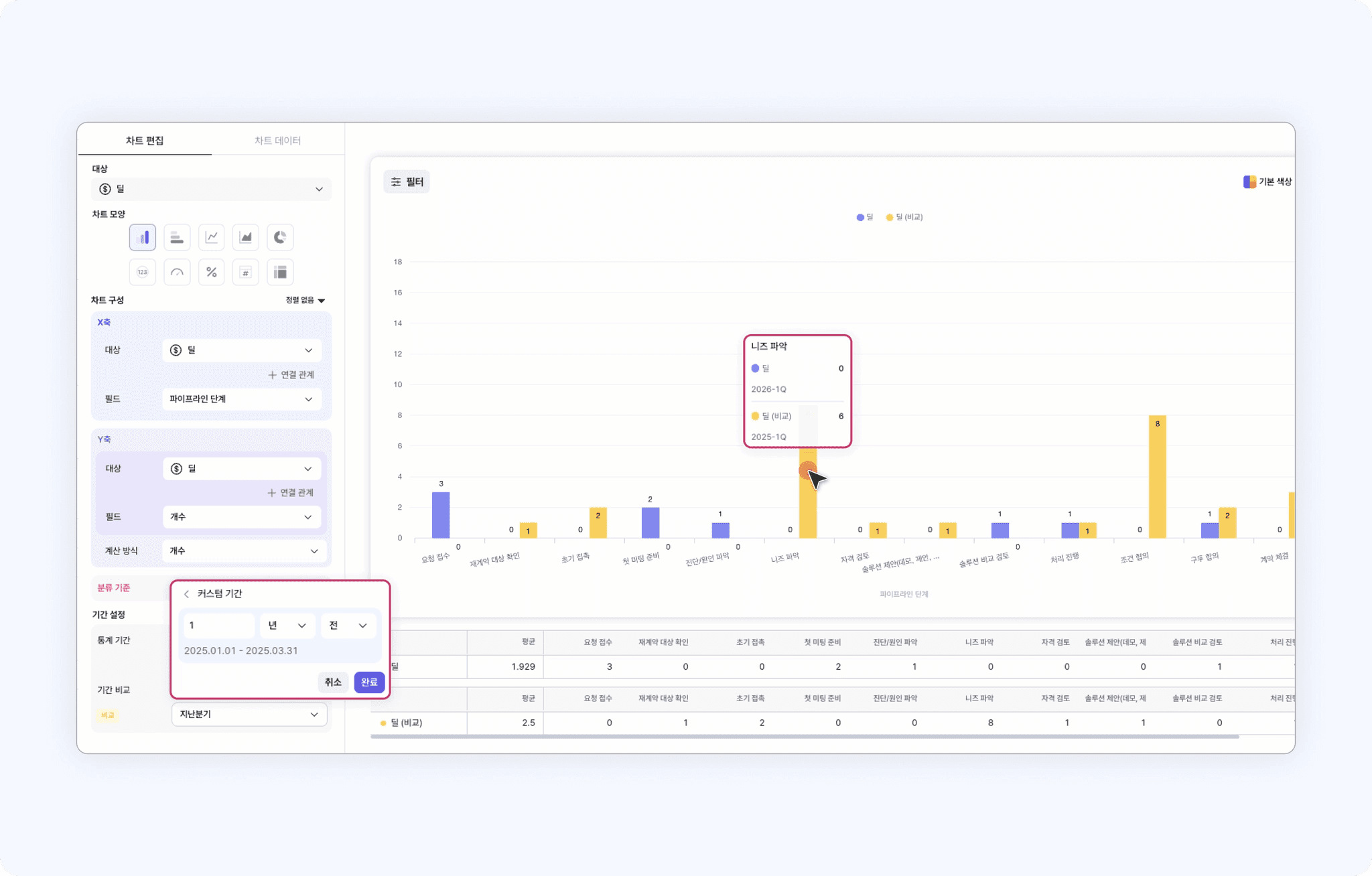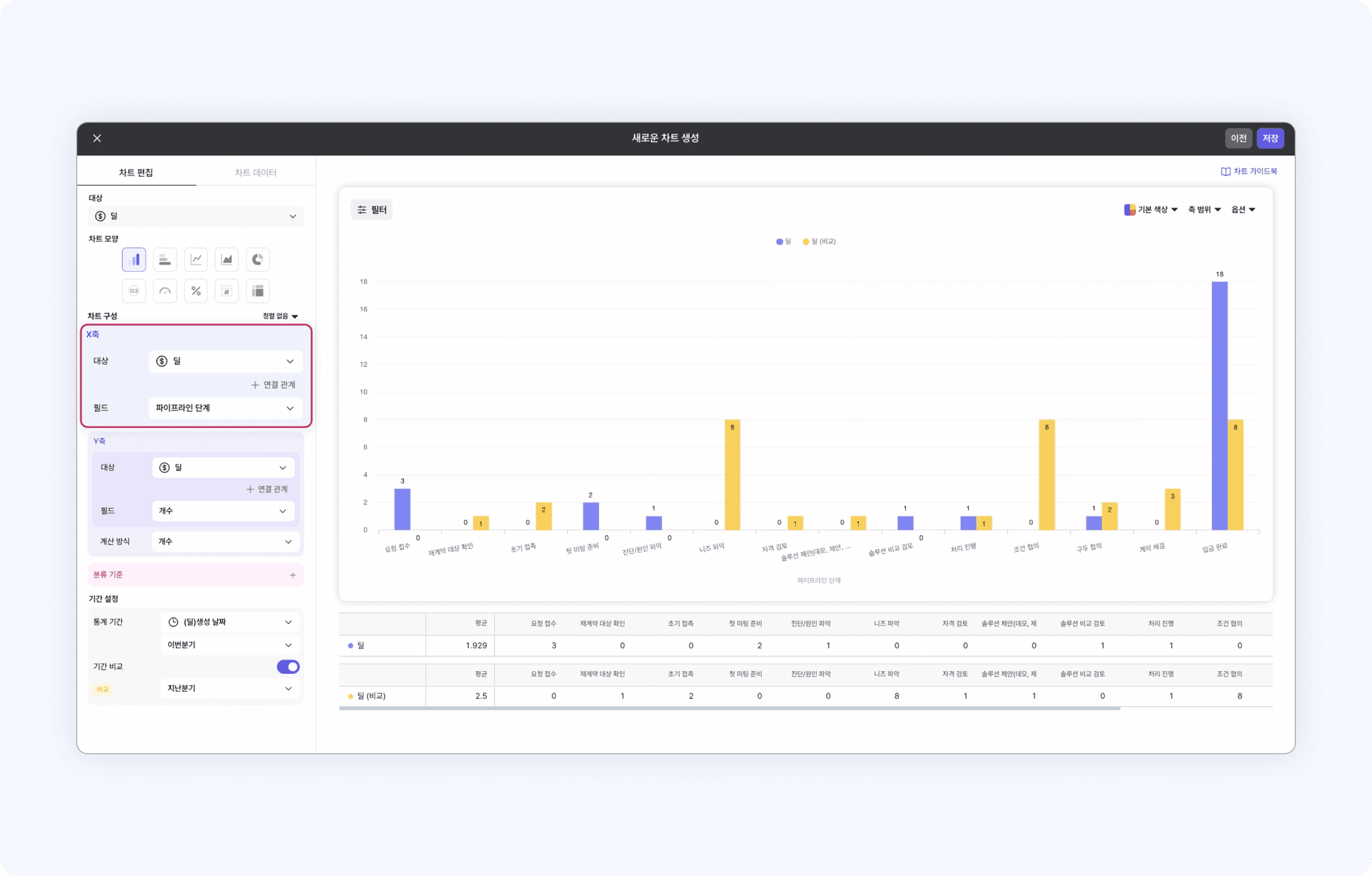 지금부터, 기간 비교 기능을 활용해 이번 분기에 파이프라인 단계별 생성된 딜 개수가 지난 분기에 대비해 어떻게 변화했는지 확인해보겠습니다.