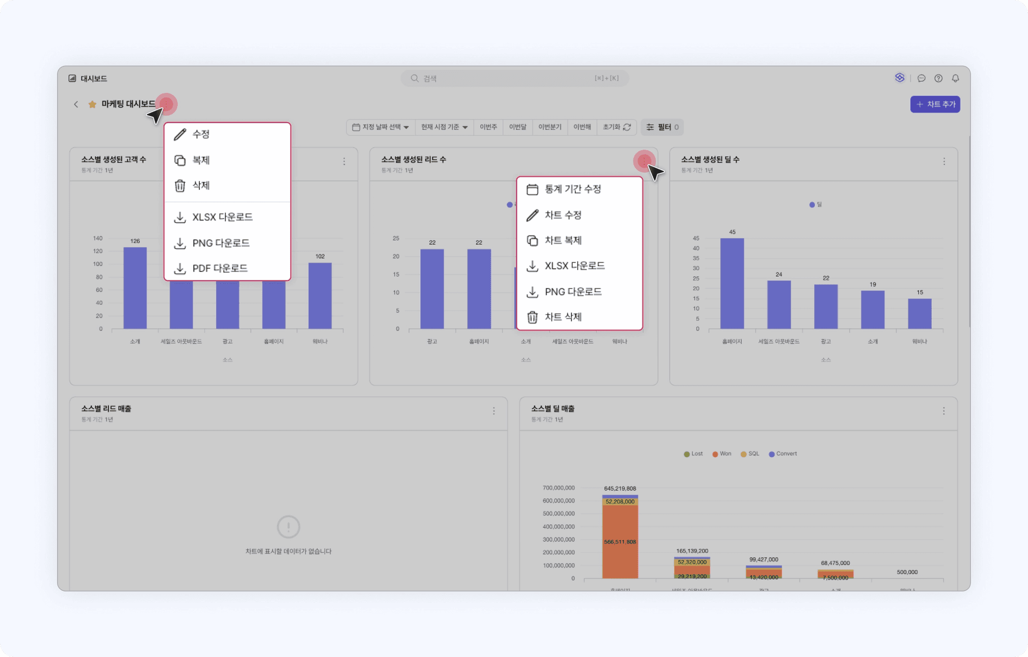 이번 업데이트로 대시보드 상세 화면에서 전체 대시보드를 XLSX, PDF, PNG 파일로 다운로드 받으실 수 있습니다. 뿐만 아니라 상세 화면 내에서 개별 차트도 XLSX, PNG 파일로 다운받으실 수 있어요.