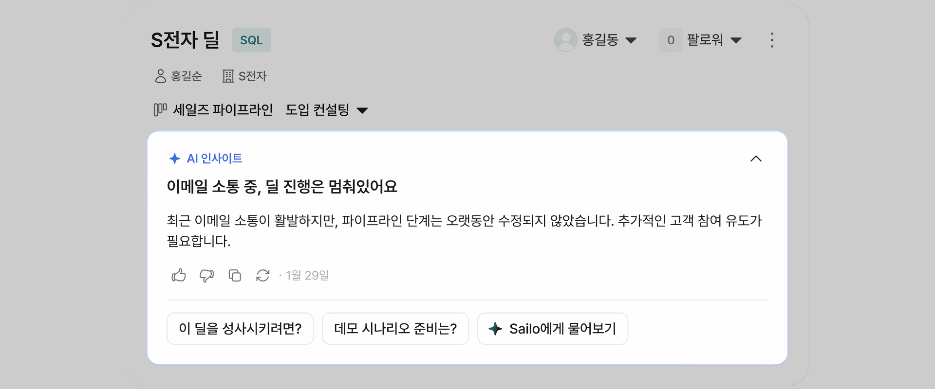 딜 상세화면에서 딜의 활동 내역을 분석해, 현재 시점에서 확인해야 할 핵심 포인트를 인사이트로 제공합니다.